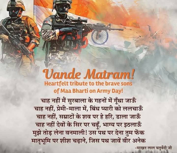 उत्तराखंड आर्मी दिवस The National News 15 January 2025 Share this: Click to share on X (Opens in new window) X Click to share on Facebook (Opens in new window) Facebook Click to share on LinkedIn (Opens in new window) LinkedIn Click to share on Tumblr (Opens in new window) Tumblr Click to share on Pinterest (Opens in new window) Pinterest Click to share on Pocket (Opens in new window) Pocket Click to share on Telegram (Opens in new window) Telegram Click to share on WhatsApp (Opens in new window) WhatsApp Click to share on Mastodon (Opens in new window) Mastodon Click to print (Opens in new window) Print Click to email a link to a friend (Opens in new window) Email Click to share on Reddit (Opens in new window) Reddit Click to share on Threads (Opens in new window) Threads Click to share on Nextdoor (Opens in new window) Nextdoor Click to share on Bluesky (Opens in new window) Bluesky अपने अटूट समर्पण और शौर्य से दिन रात भारतीय सीमाओं की रक्षा करने वाले वीर जवानों, पूर्व सैनिकों और उनके परिवारों को सेना दिवस की हार्दिक शुभकामनाएँ। आपके अदम्य साहस और बलिदान को हर भारतीय नमन करता है। #ArmyDay जय हिंद, जय भारत! Like this:Like Loading... Related Continue Reading Previous: कुंभ मेले में 12 से ज्यादा लोगों की हार्ट अटैक से मृत्युNext: शांतरशाह प्रकरण के मुख्य आरोपी को गिरफ्तार करने की मांग Leave a Reply Cancel replyYour email address will not be published. Required fields are marked *Comment * Name * Email * Website Save my name, email, and website in this browser for the next time I comment. Notify me of follow-up comments by email. Notify me of new posts by email. Related Stories उत्तराखंड करोड़ों का बजट स्वाहा, पर जनता ने फेरा मुँह! » The National News 24 March 2026 उत्तराखंड रुड़की ब्लॉक के प्रधान अध्यक्ष श्रवण कुमार का जिले में बजा डंका The National News 24 March 2026 उत्तराखंड DM मयूर दीक्षित का ‘गुरु मंत्र’: धनौरी के छात्र-छात्राओं को सिखाए सफलता के गुर The National News 24 March 2026