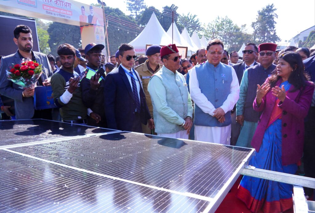 मुख्यमंत्री पुष्कर सिंह धामी ने सोमवार को रेंजर्स ग्राउण्ड देहरादून में ‘ उत्तराखण्ड के प्रथम सोलर मेले दो दिवसीय ‘सौर कौथिग’ का शुभारंभ किया। इस अवसर पर उन्होंने पीएम सूर्यघर योजना, मुख्यमंत्री सौर स्वरोजगार योजना और सोलर वाटर हीटर योजना के लाभार्थियों को अनुदान राशि के चेक प्रदान करने के साथ ही यूपीसीएल मुख्यालय में बनाई गई सौर ऊर्जा आधारित म्यूरल आर्ट का लोकार्पण भी मुख्यमंत्री ने किया। मुख्यमंत्री ने सौर ऊर्जा जन जागरूकता के लिए चलाई जा रही सोलर वैन को भी हरी झण्डी दिखाकर रवाना किया। इसके माध्यम में आगामी सौ दिनों तक सोलर ऊर्जा से संबंधित विभिन्न जानकारी लोगों को दी जायेगी। साथ ही विभिन्न स्टॉल पर जाकर सौर ऊर्जा के क्षेत्र में किए जा रहे नवोन्मेषी प्रयोगों की जानकारी ली।