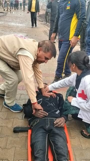 इंडियन रेडक्रॉस सचिव डॉ० नरेश चौधरी ने अवगत कराया कि आपदा की मॉकड्रिल के अंतर्गत रेड क्रॉस स्वयंसेवकों ने भी सभी घटनास्थलों पर बिना समय गंवाए शीघ्रता से पहुंचकर प्रभावित जनमानस को यथा संभव प्राथमिक उपचार देकर घायलों को भी शीघ्र अतिशीघ्र अस्पताल पहुंचवाने में सक्रिय सहभागिता की तथा समय से कुछ घायलों को सी०पी०आर०(कार्डियो पलमोनरी रिसेसियेशन) दिल की धमनी को पुनः चालू करना, कृत्रिम स्वांस देने के उपरांत प्राथमिक उपचार देते हुए समय से चिकित्सालय पहुंचाने में सहयोग किया।