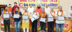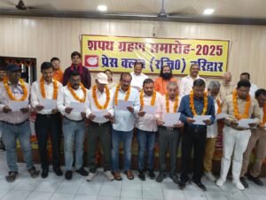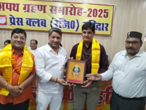 हरिद्वार, 2 अप्रैल। प्रेस क्लब सभागार में आयोजित शपथ ग्रहण समारोह में नवनिर्वाचित प्रेस क्लब अध्यक्ष धर्मेन्द्र चौधरी, महामंत्री दीपक मिश्रा व कार्यकारिणी को बुधवार को मुख्य चुनाव अधिकारी प्रदीप गर्ग एवं मुख्य अतिथी महामंडलेश्वर स्वामी रूपेंद्र प्रकाश, मेयर किरण जैसल एवं विधायक रवि बहादुर ने पद के प्रति निष्ठा की शपथ दिलायी।