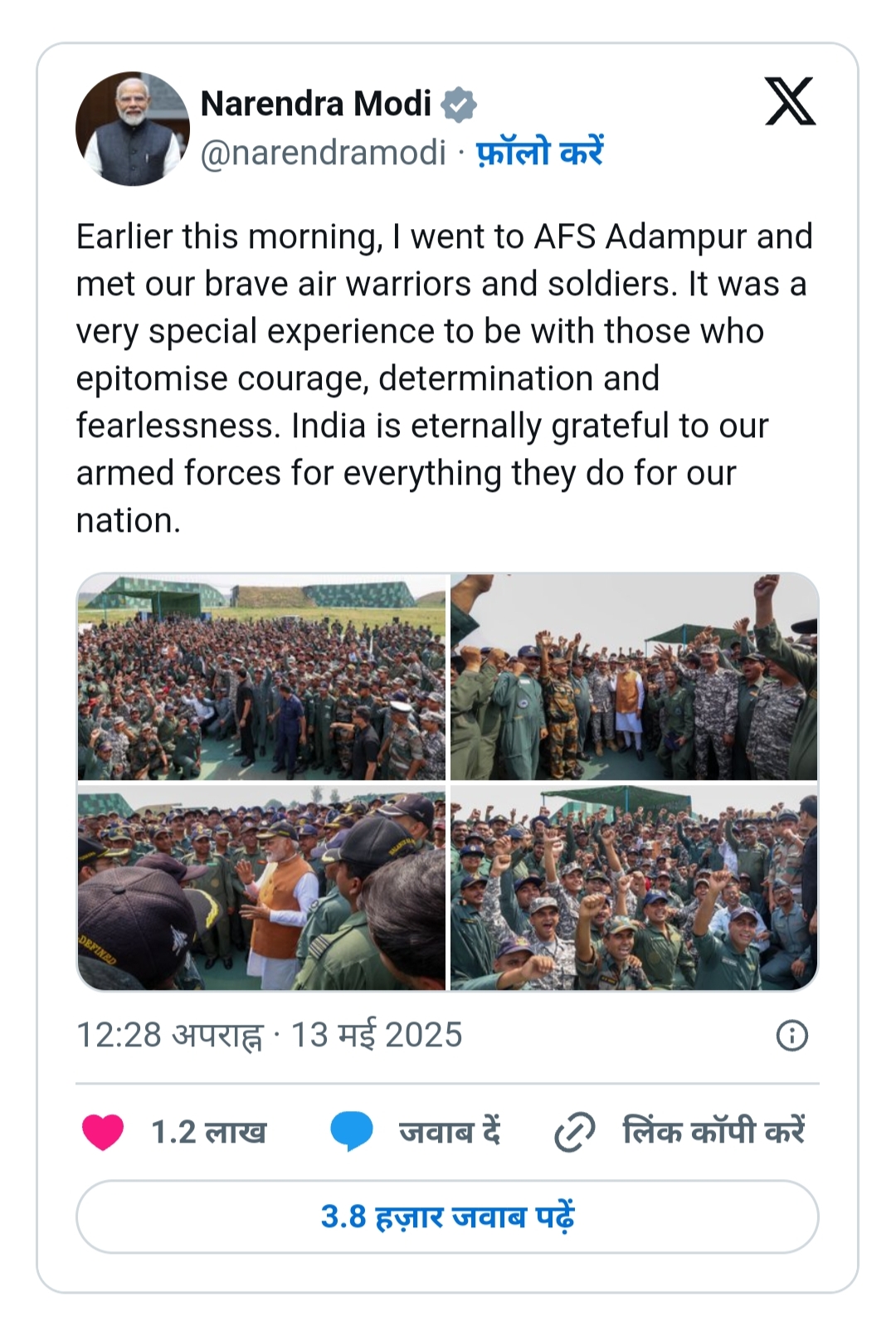 “आज सुबह, मैं एएफएस आदमपुर गया और हमारे बहादुर वायु योद्धाओं और सैनिकों से मिला। साहस, दृढ़ संकल्प और निडरता के प्रतीक उन लोगों के साथ समय बिताना बहुत ही विशेष अनुभव था। भारत हमारे सशस्त्र बलों के प्रति हमेशा आभारी रहेगा, जो हमारे देश के लिए सब कुछ करते हैं।