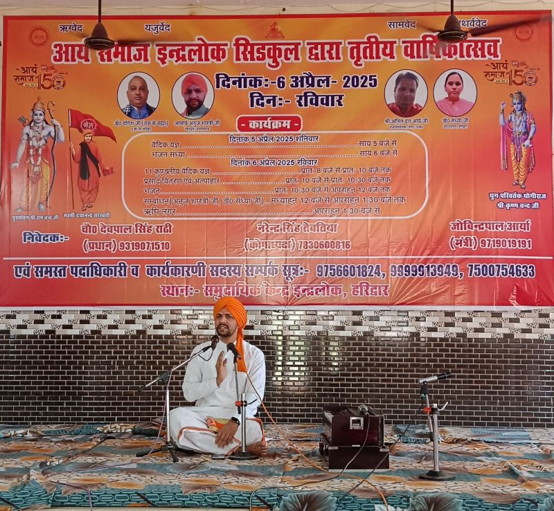 हरिद्वार। आज 7.4.2025 को आर्य समाज, इंद्रलोक, सिडकुल का तृतीय वार्षिकोत्सव सम्पन्न हुआ। इस कार्यक्रम में सुबह आठ बजे ग्यारह कुण्लीय यज्ञ किया गया जिसमें आर्य समाज इंद्रलोक सिडकुल हरिद्वार के सभी आर्यों ने बड़ी संख्या इंद्रलोक एवं आसपास के लोगों ने इसमें में भाग लिया।
