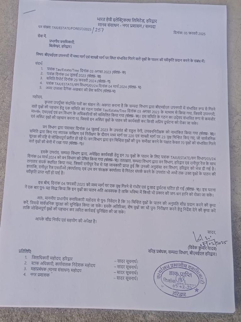 पत्र मे घटना का जिक्र करते हुए अनुरोध शीघ् अनुमति का किया है।परोक्ष रूप से सड़क के किनारे या सड़क पर होने वाली दुर्घटना का संबंध भेल के प्रबंधन से ही है। सूत्रों की माने तो भेल प्रबंधन सड़क से गुजरने वाले सभी कमर्शियल व्हीकल से टैक्स वसूलती आ रही है फिर उस सड़क की पूरी जिम्मेदारी भेल प्रबंधन की ही बनती है।